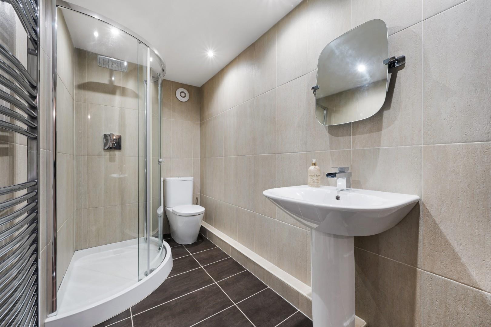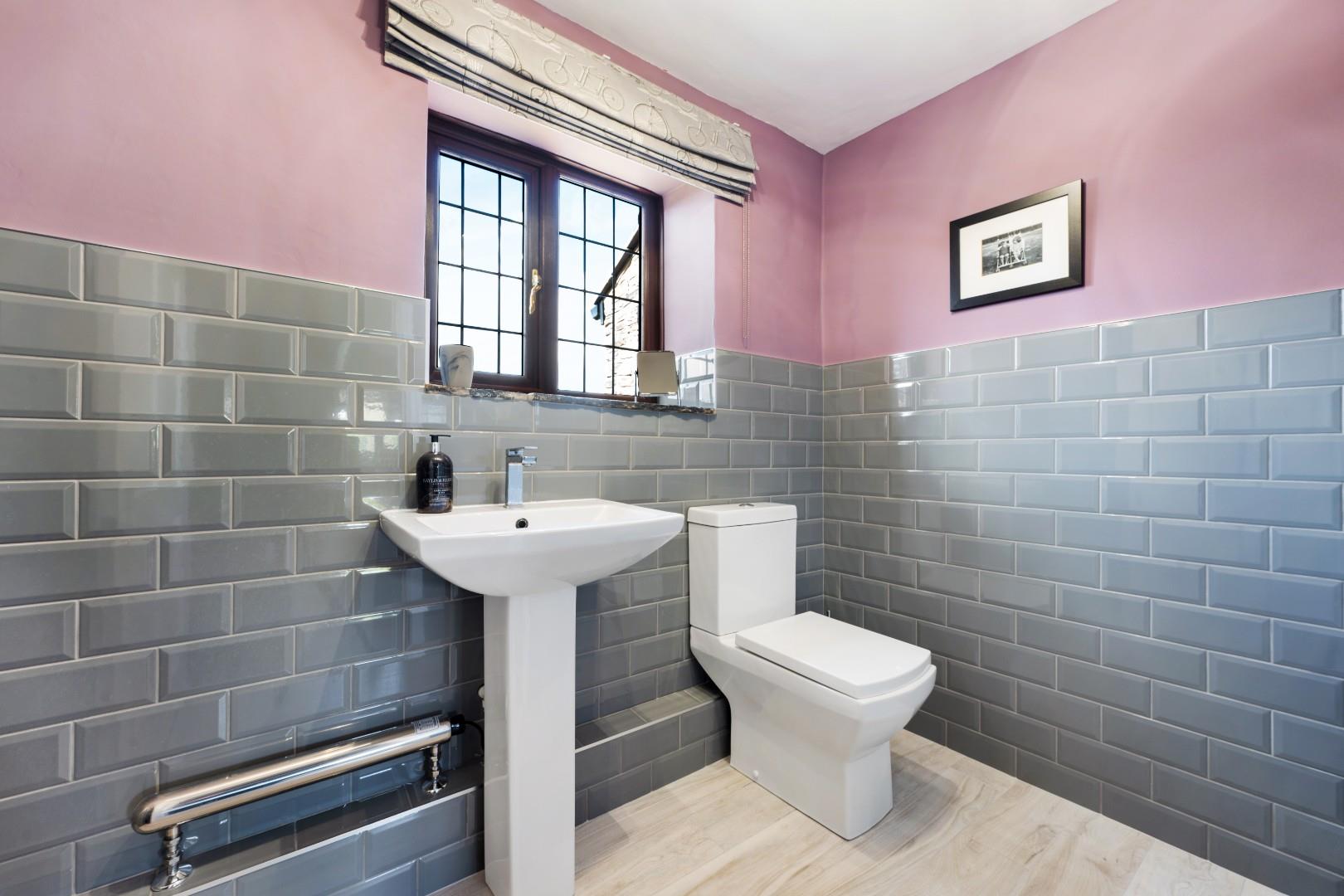 A conveniently located downstairs WC features modern tiled walls and a wood-effect stone tiled floor, completing the ground floor amenities.