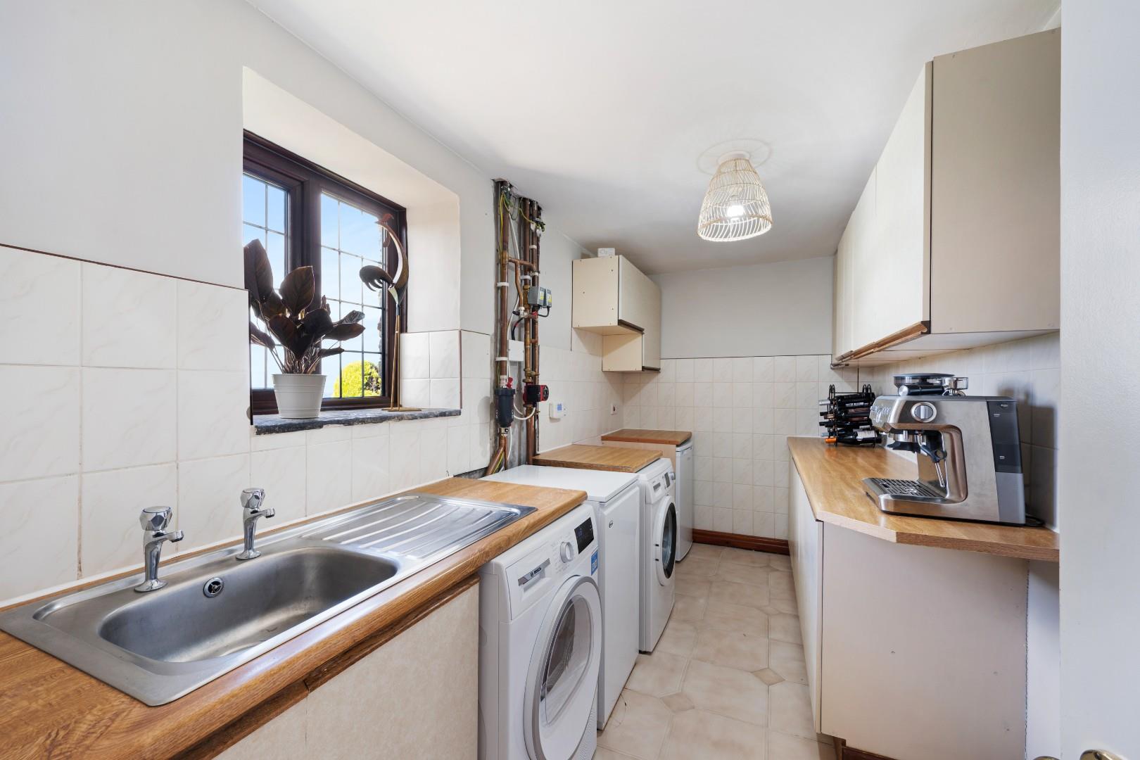 Further practicality is offered by a separate utility room, generous in size and equipped with plumbing for a washer and dryer, alongside the boiler, an additional sink, worktop space, and further storage.