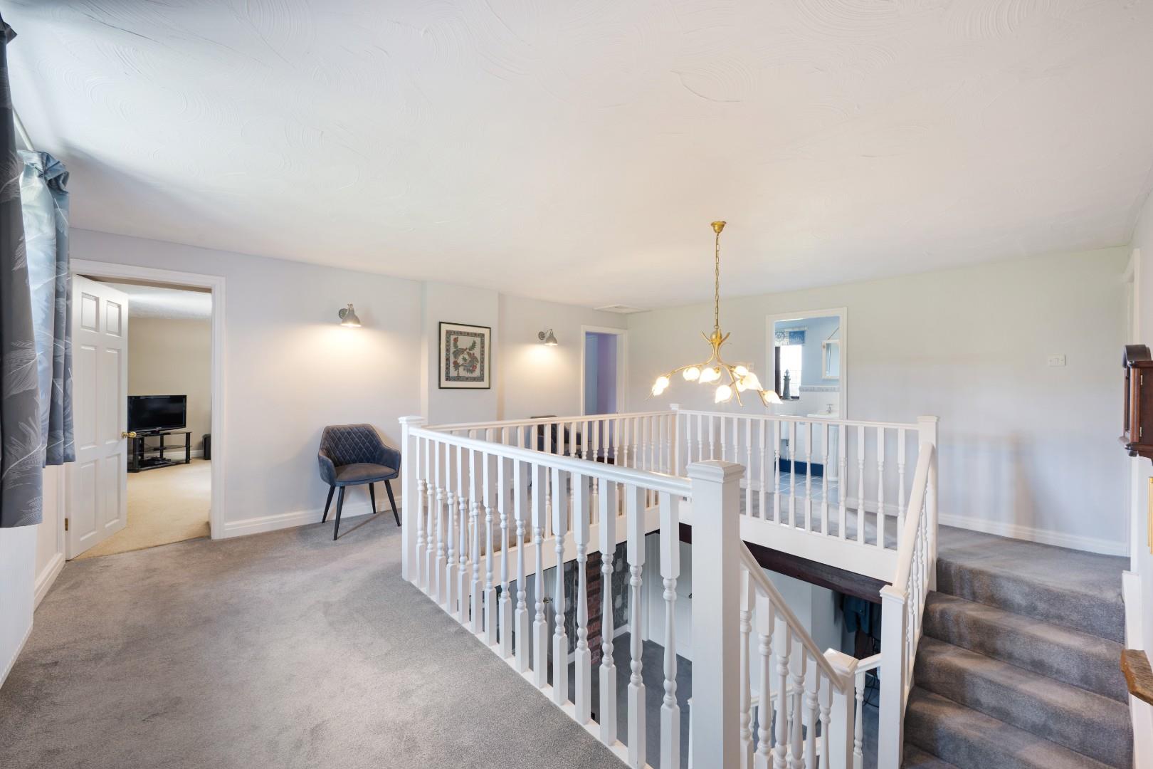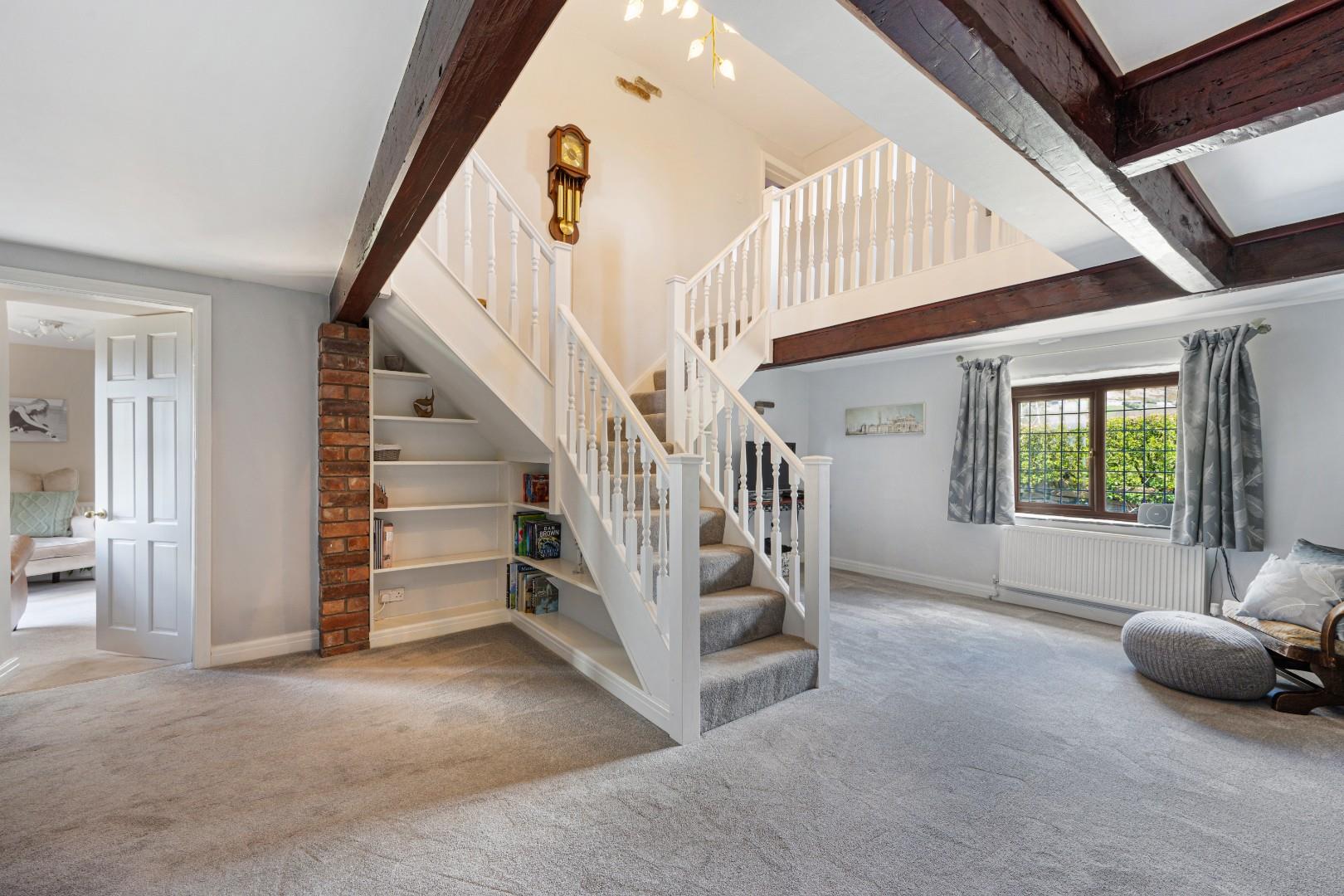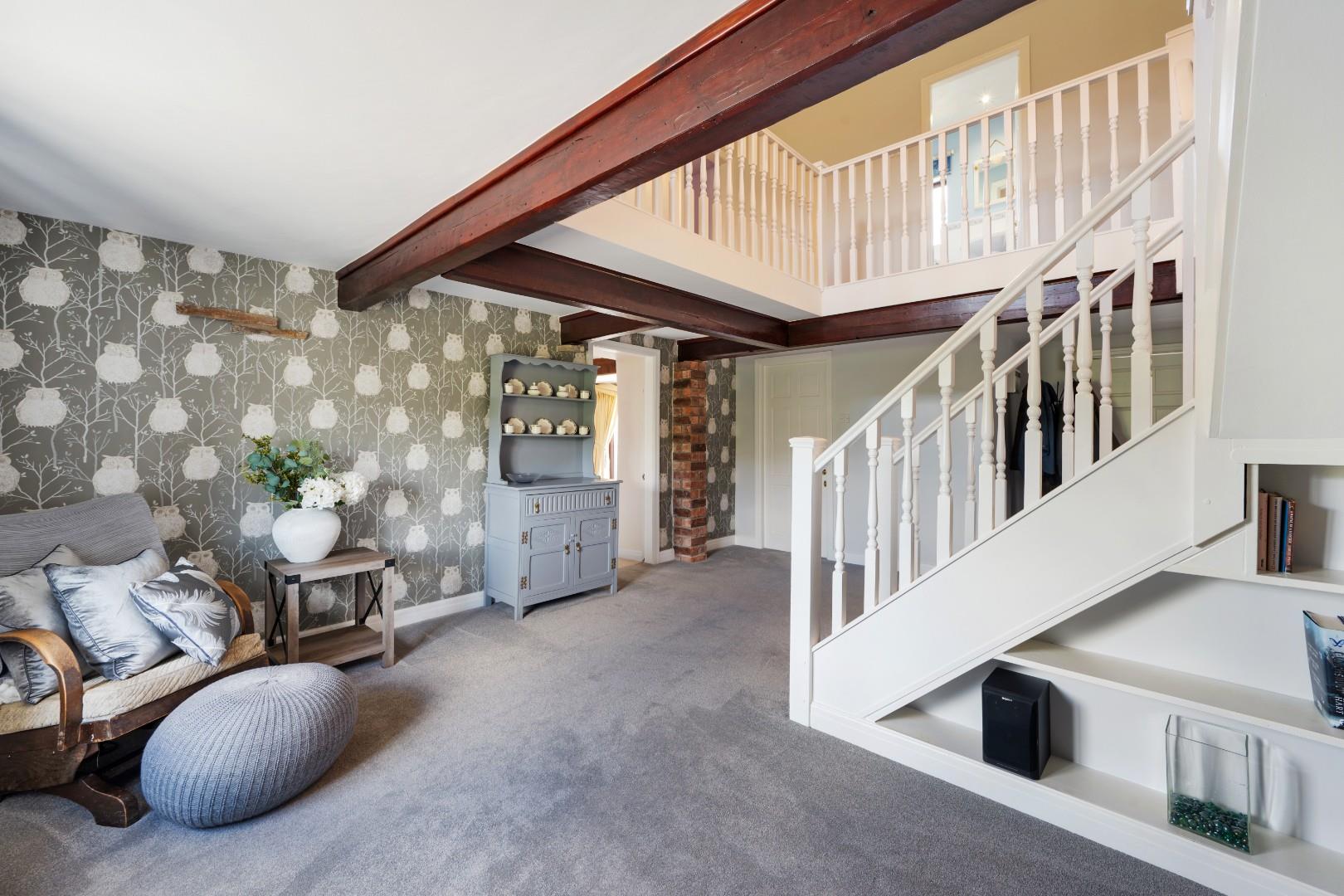 The reception hall is an impressive and versatile space, enhanced by the striking galleried landing above and exposed beams that add to the home’s character. Generous in size, it offers flexibility for a variety of uses, whether as a welcoming entrance, home working area, or a play space for young children.