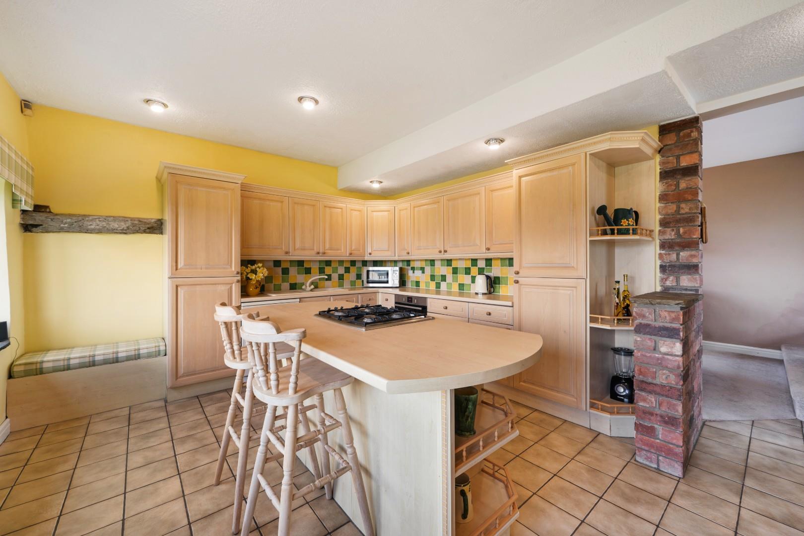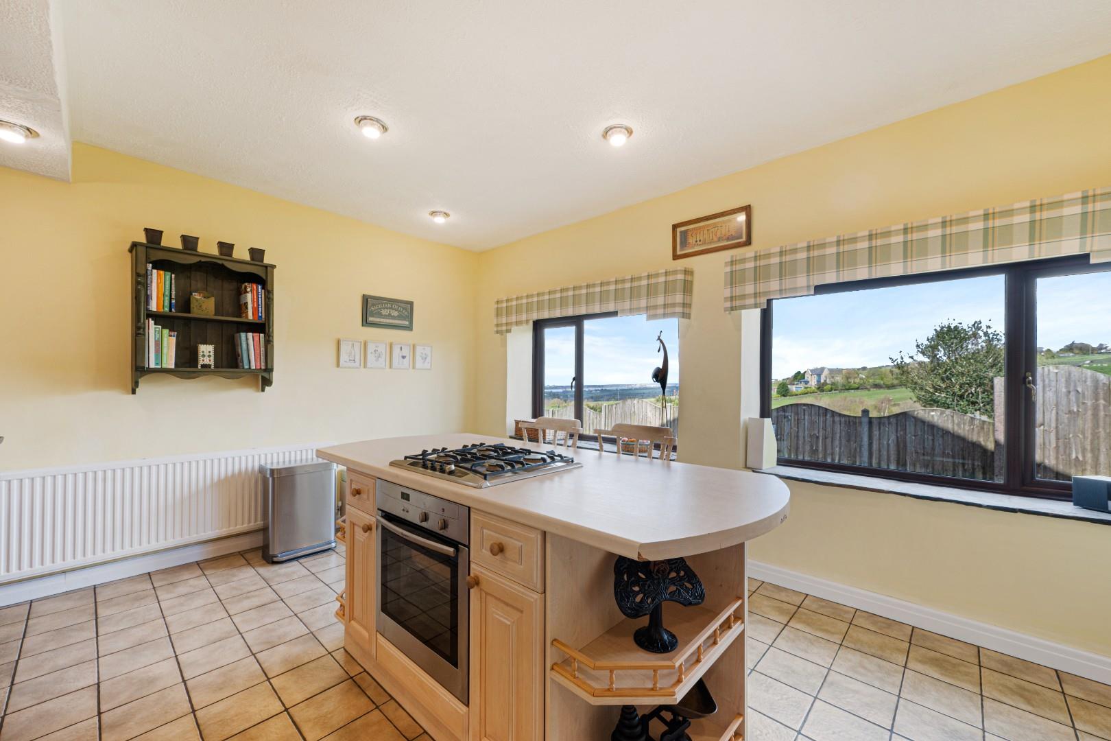 The kitchen is a spacious and sociable hub of the home, centred around a substantial island with integrated gas hob and breakfast seating—ideal for informal dining and everyday family life.