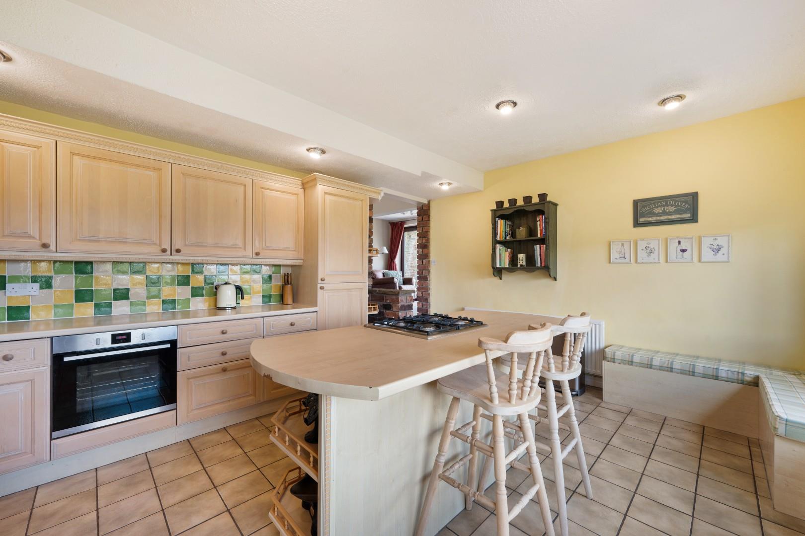 A step up leads to the adjoining sitting area, where large sliding glass doors open directly onto the garden, framing far-reaching countryside views and allowing natural light to flood the space. The split-level design, complemented by exposed brick detailing, adds character while subtly defining each area within this sociable, open-plan layout.