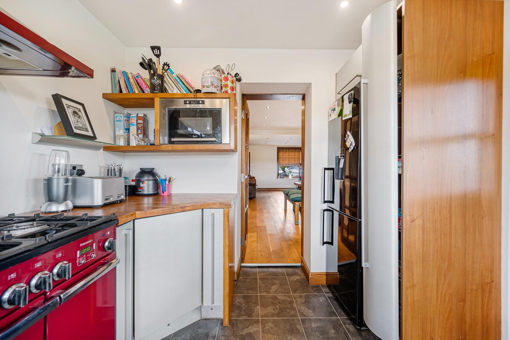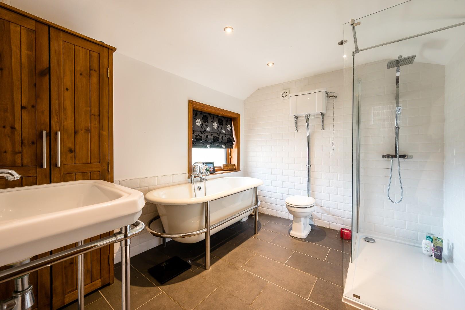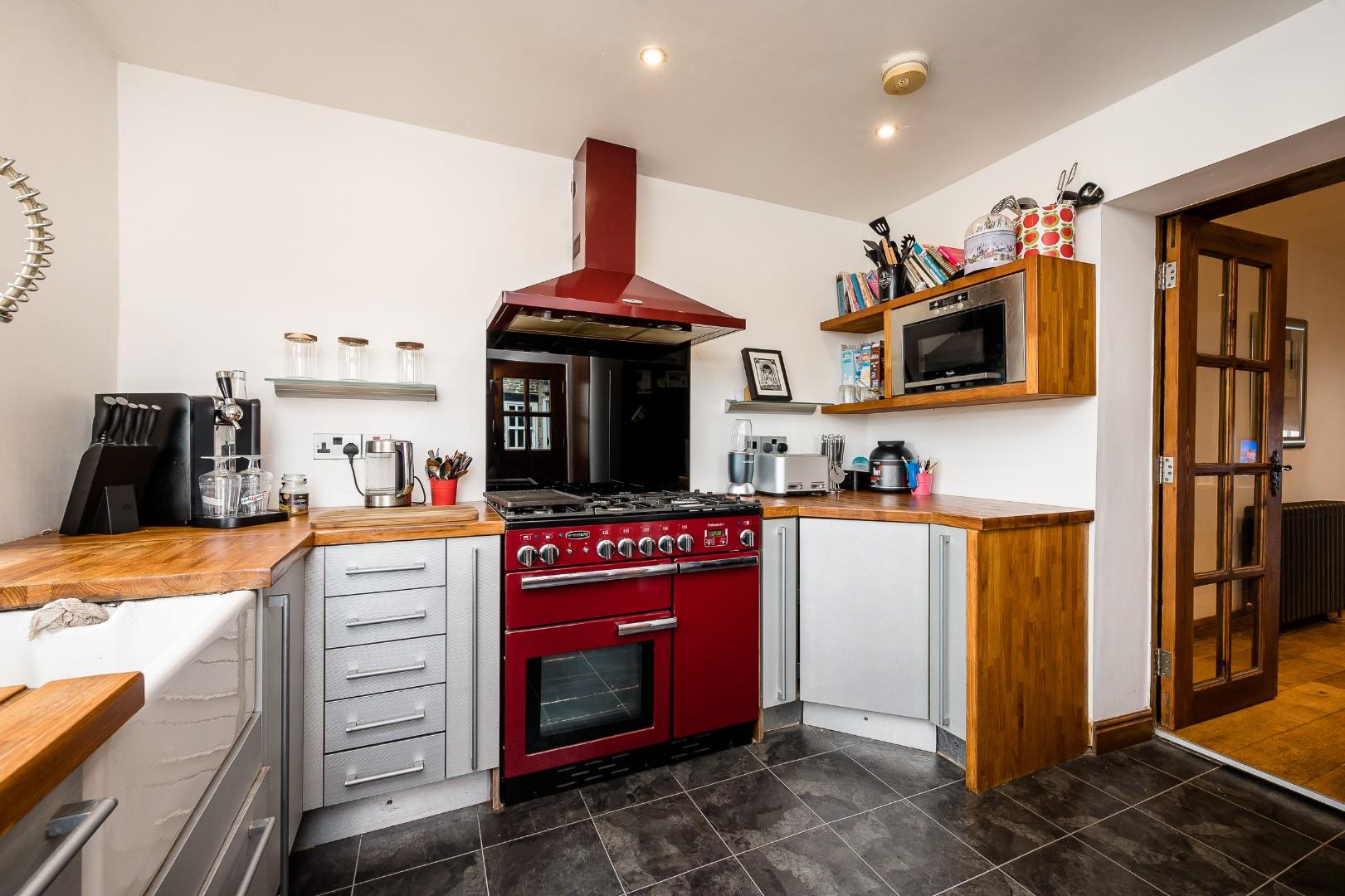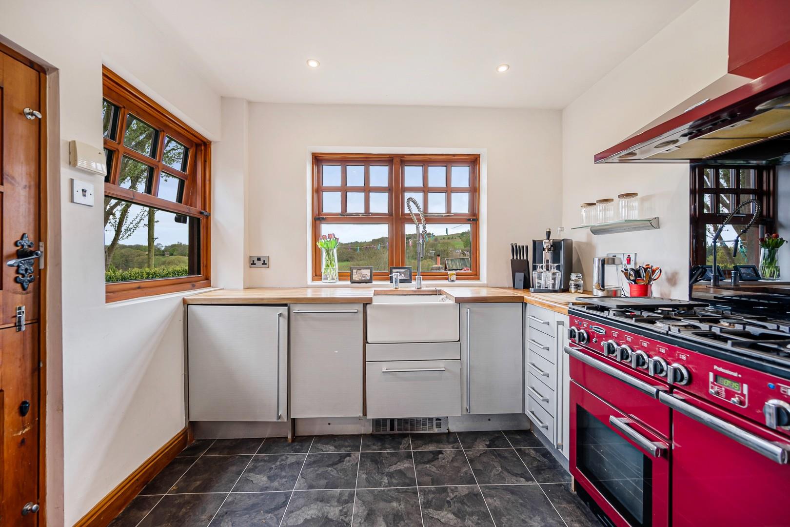 The kitchen is situated to the rear where more scenic views can be appreciated, and design comprises a rustic wood worktop in keeping with the country vibe, and steel-effect cupboard fronts add a modern industrialism touch. Integrated appliances include a brilliant red Rangemaster cooker, dishwasher, Belfast sink with swan neck flexi tap, and larder cupboards offer practical storage space.