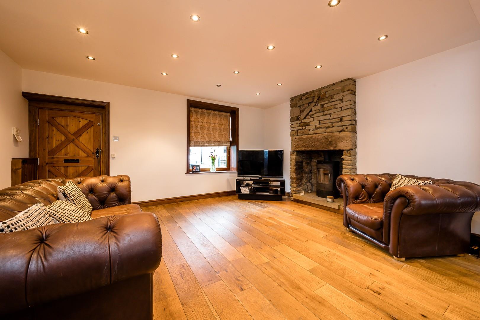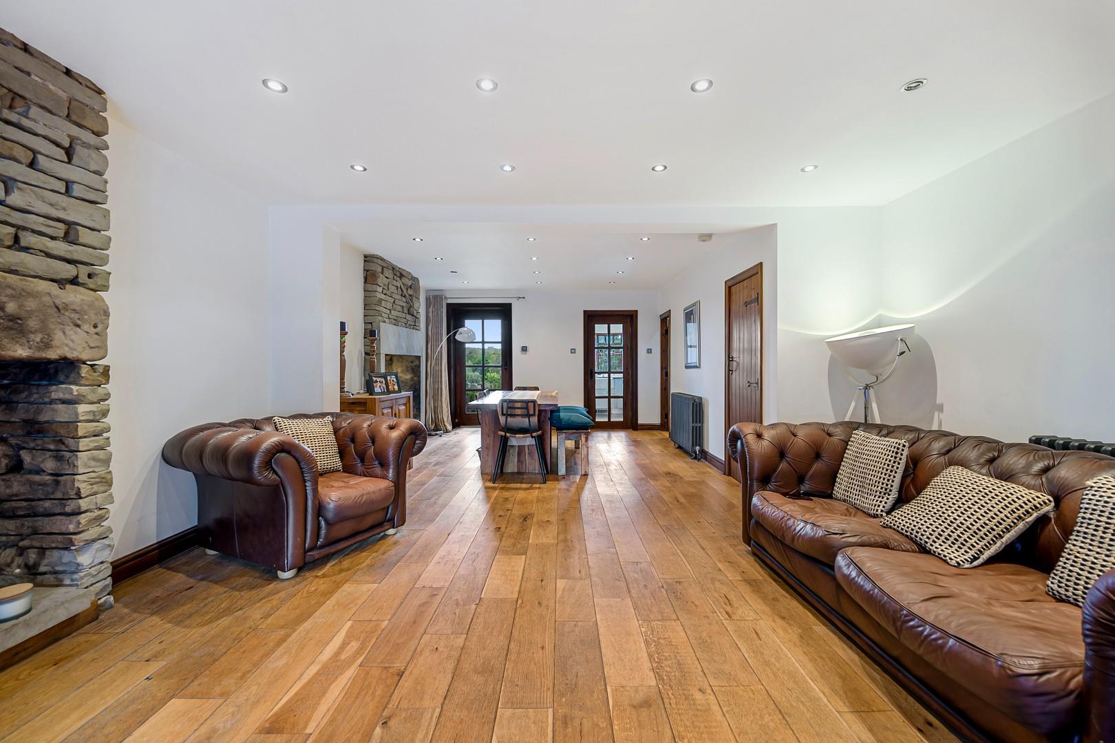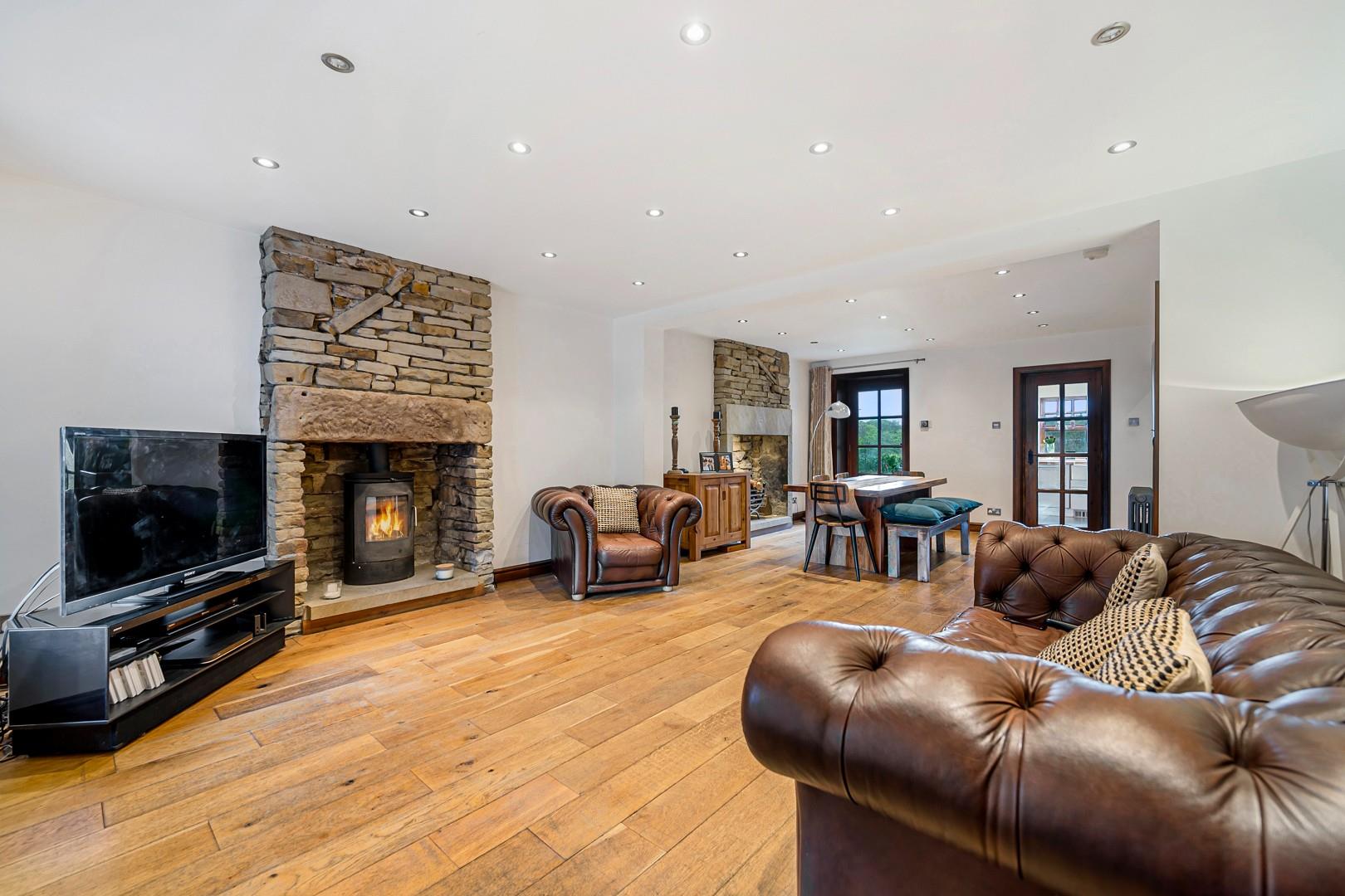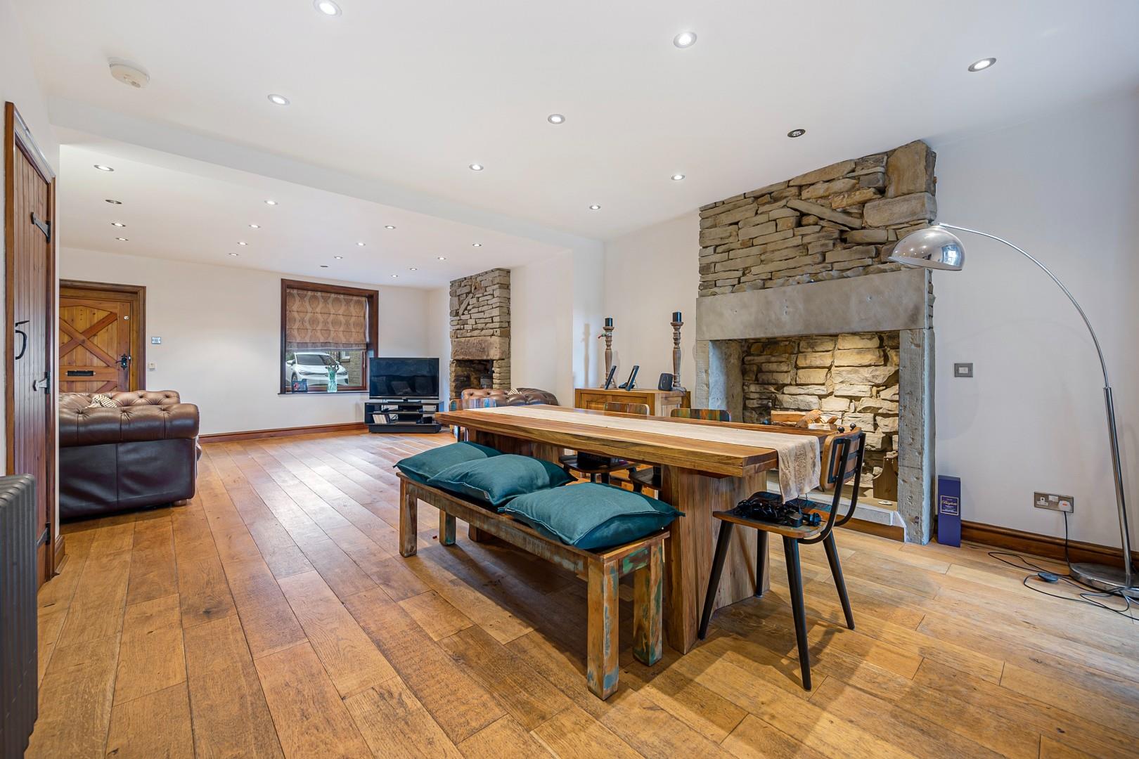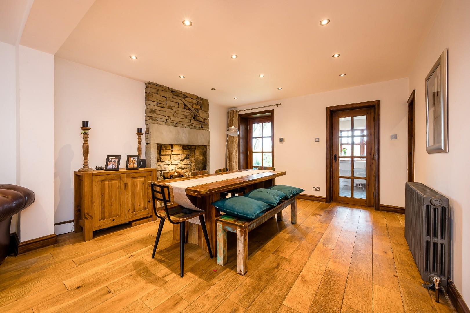 The oak floor and exposed stone creates a contrast to the fresh white modern walls, and the first chimney breast houses a large modern log burner and offers itself as an ideal spot for the lounge area. To the rear is the dining area with another gorgeous stone fireplace, and a framed glass back door brings the lush countryside and treetop canopy in view while dining with loved ones.