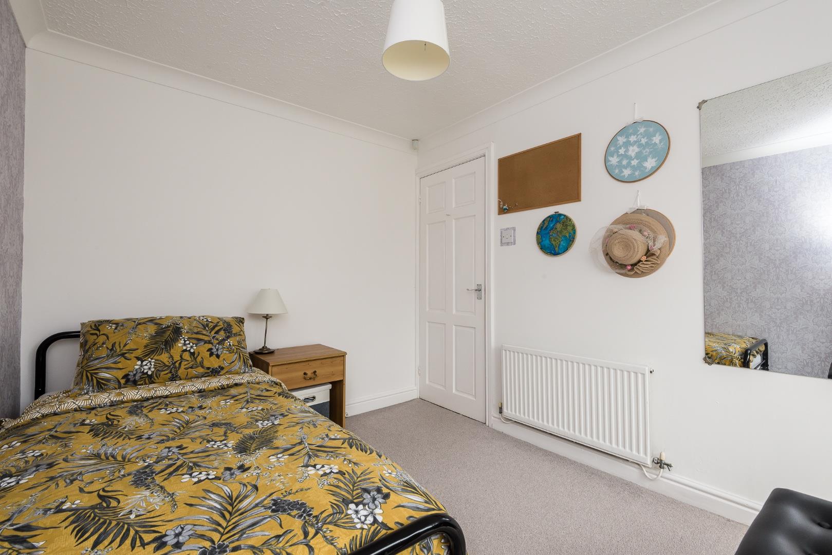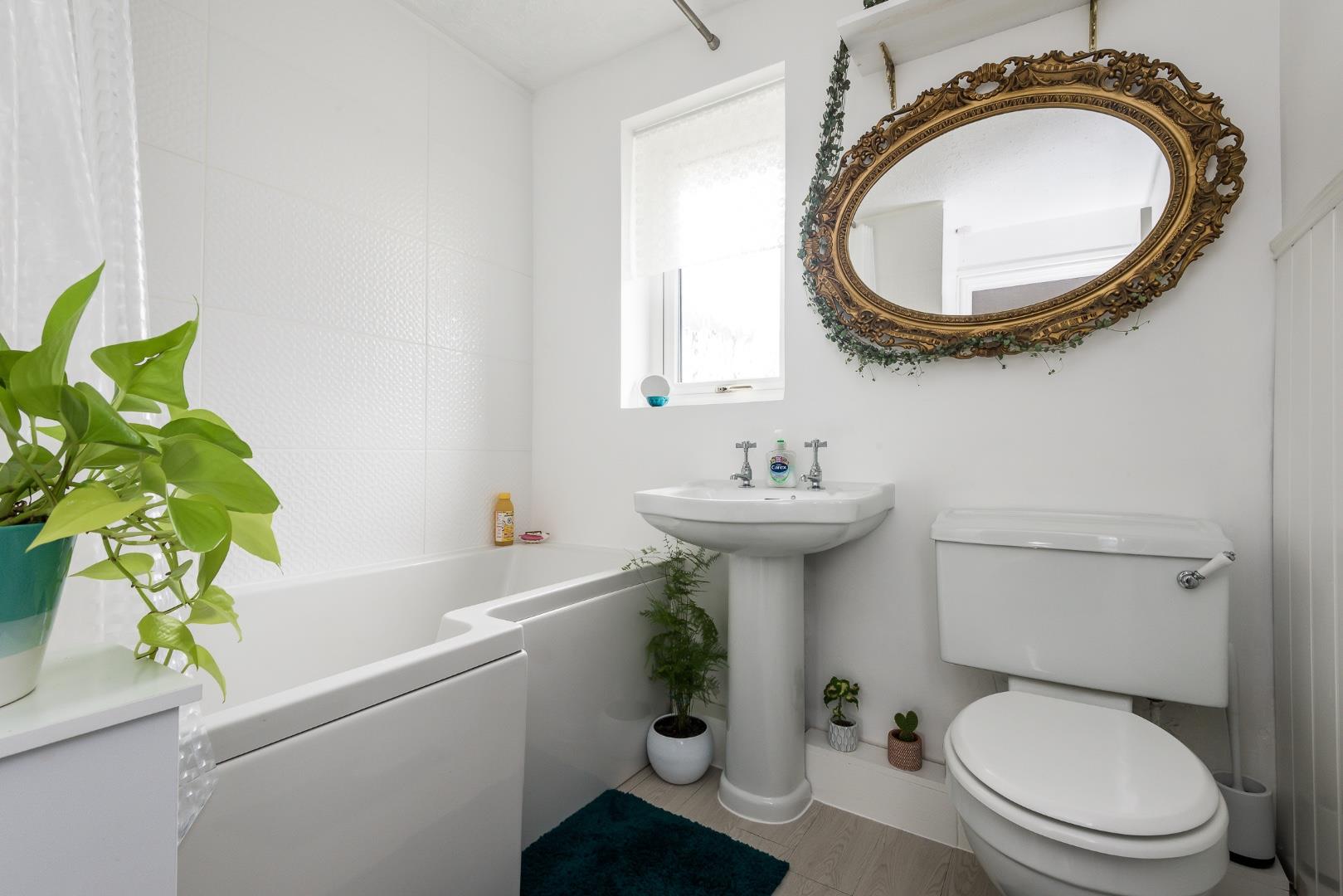 At the centre of the home to the rear is the bathroom, where contemporary white décor complements the white three-piece suite, including bath with shower, wash basin and WC. The bathroom also features modern grey flooring, white wooden wall panelling and part-tiled walls with white textured tiles. The shower here benefits from two heads – a waterfall style showerhead in addition to a flexible handheld head. Like the rest of the home, the bathroom is pristine, ready for you to simply move in, unpack, and enjoy.
