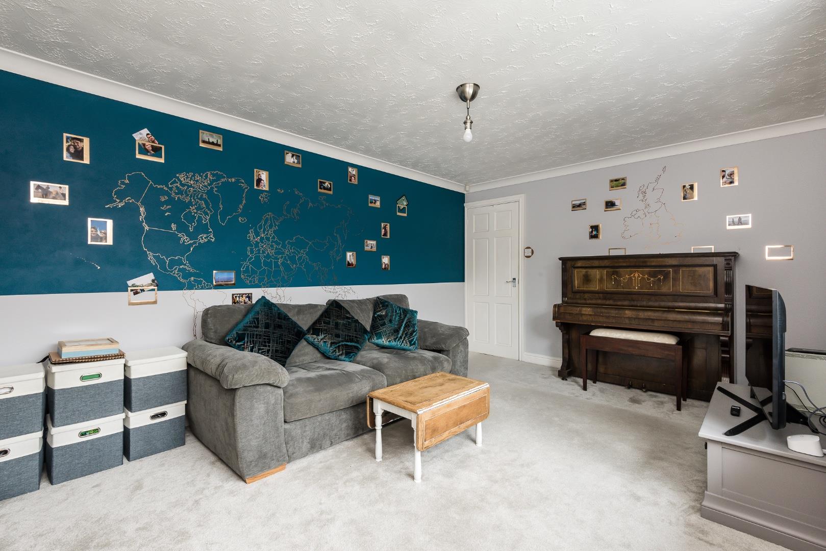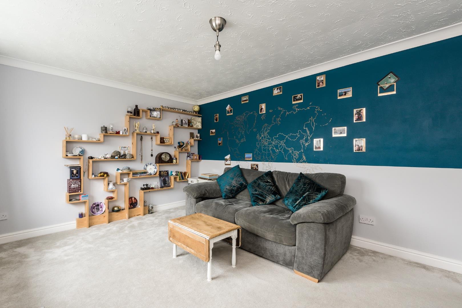 To the left of the entrance hall lies the lounge – a bright and airy space looking out into the cul-de-sac where a large front window pours in an abundance of natural light. A soft grey carpet adds a touch of contrast to the white skirtings and light grey walls, while a navy-blue feature wall and decorative gold outlined world map brings a splash of colour to the room – fitting to those out where with a case of wanderlust! While being bright and airy this room is homely too, providing the perfect spot to put your feet up, relax, and unwind after a long day out and about.