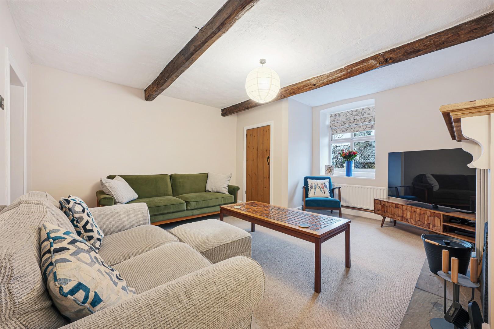 The steps to the front of the property welcome you into the entrance vestibule which is always a handy addition for keeping shoes and coats tidy and out the way. Through to the lounge and the cosy cottage character shines through, with rustic beams overhead and an original feature fireplace with open fire, stone hearth and tiled surrounds, all brought together with fresh contemporary décor which you can simply move into and unpack without lifting a finger. The carpet in the lounge was installed new in late 2025.