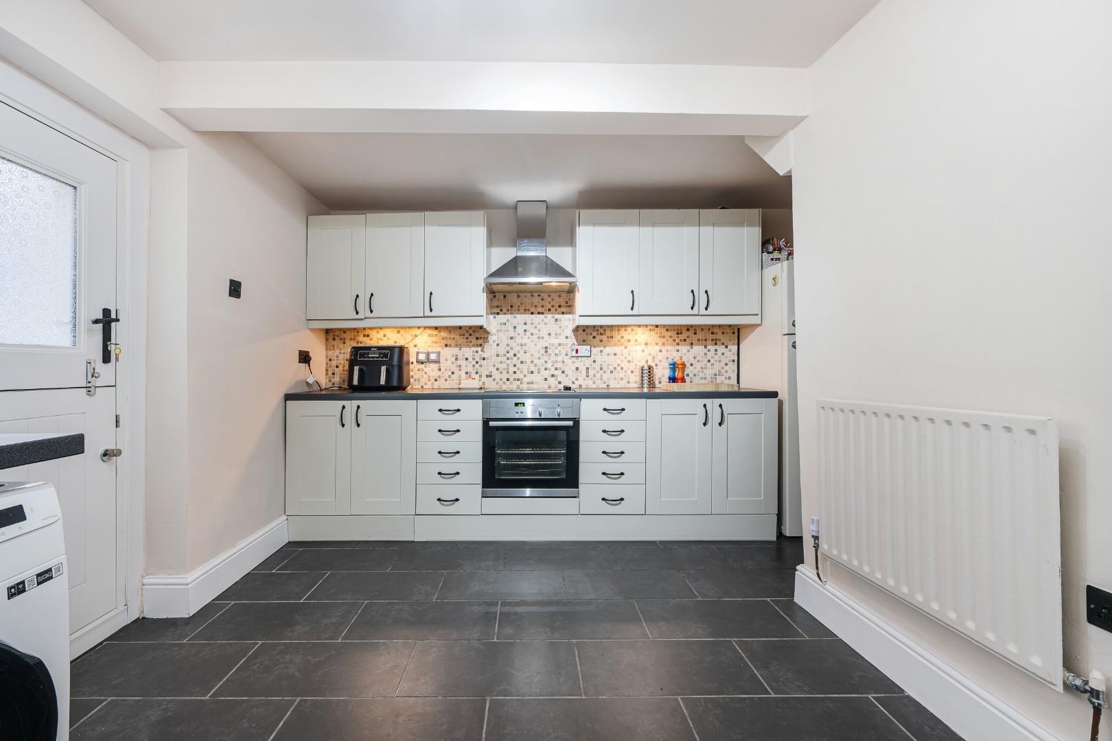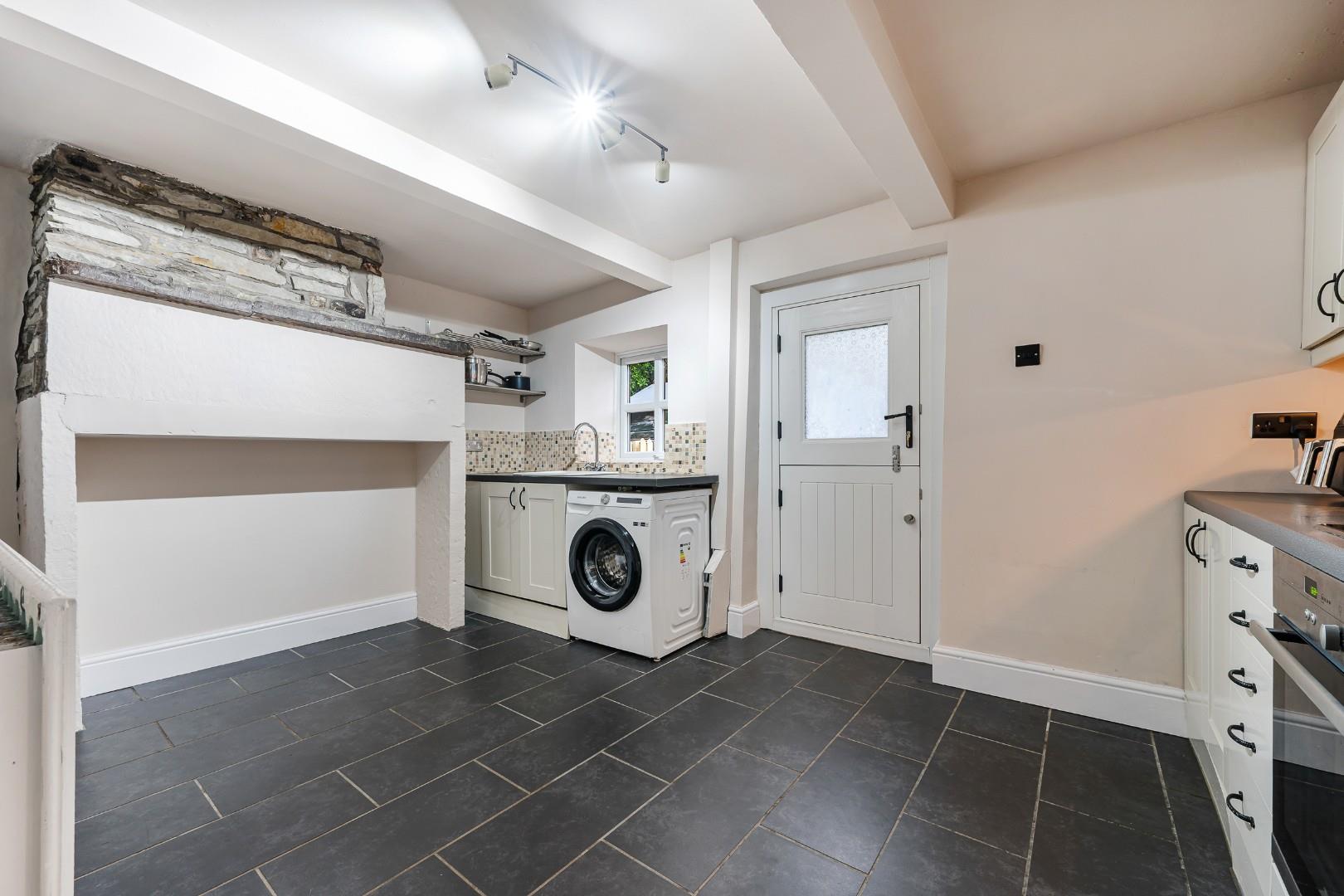 The kitchen is situated to the rear where the charming character continues, including an original stone chimney breast, and stable door into the rear courtyard. The kitchen features black tiling to the floor and traditional shaker style cabinetry, with ample space for a dining table too. Fitted appliances include an integrated Neff oven and four-plate hood with extractor, and a traditional white sink with swan neck mixer tap.