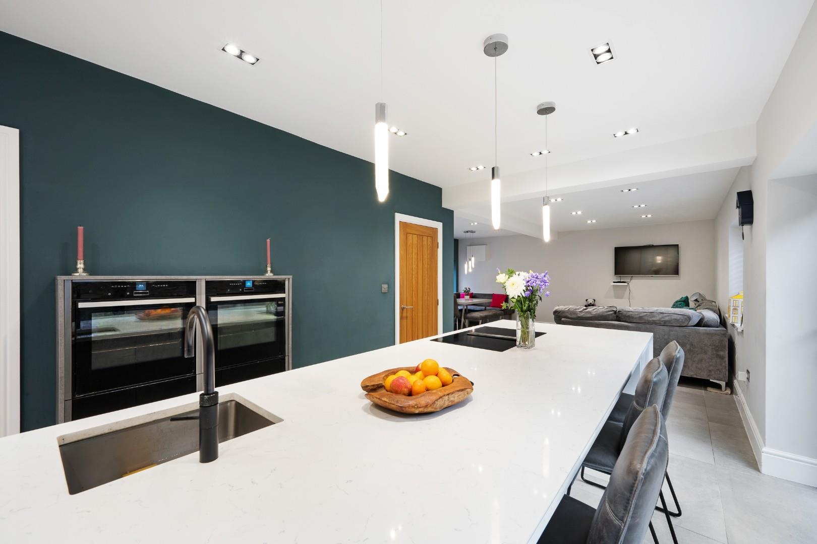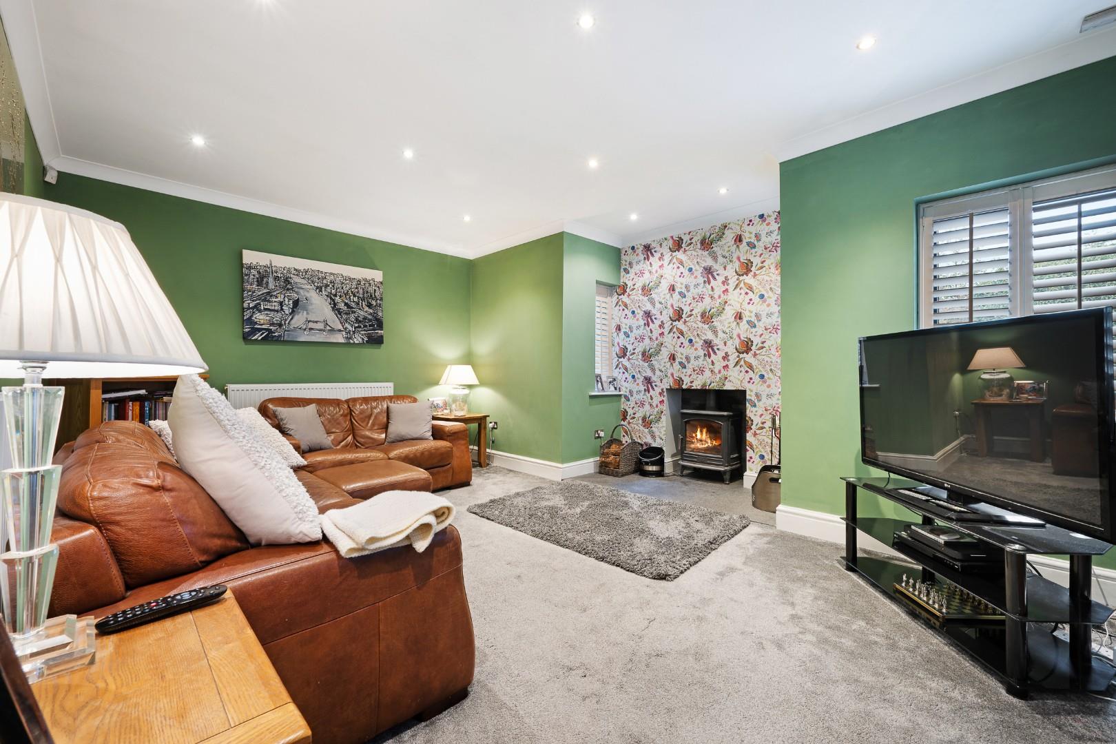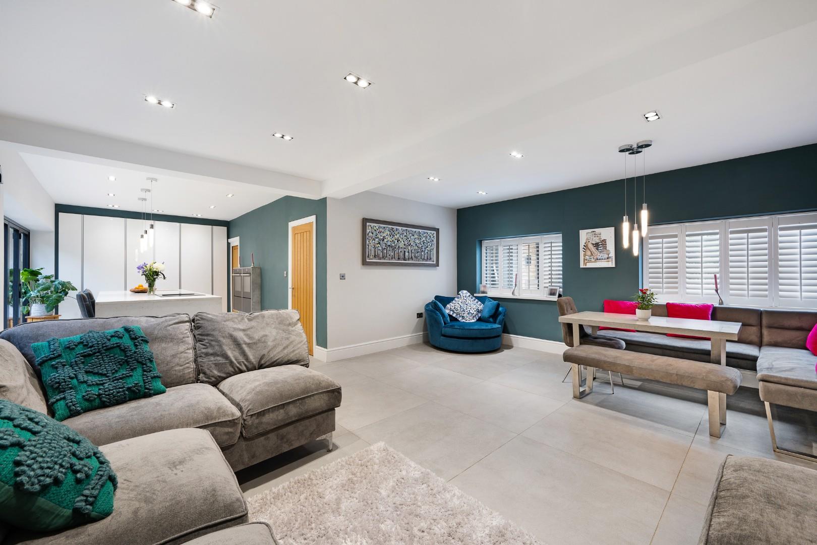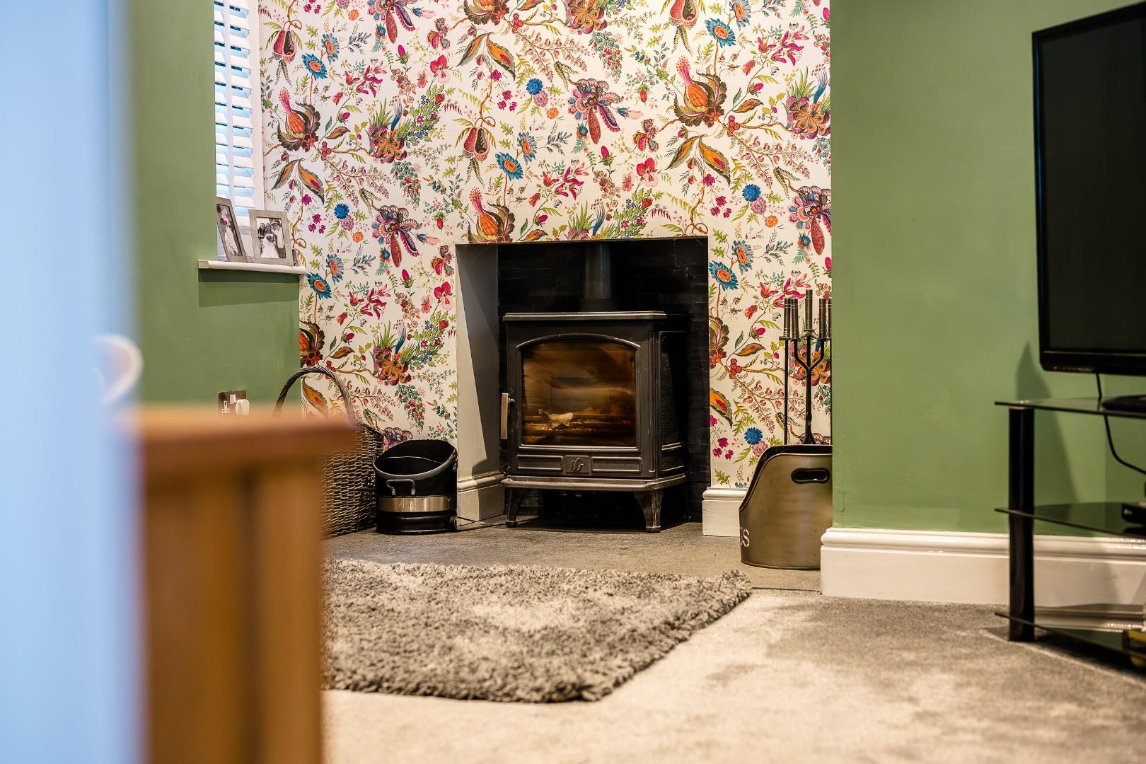 The open-plan design ensures a wonderfully fresh and airy atmosphere, complemented by sleek finishes and thoughtful lighting. In contrast, to the front of the property lies an equally generous yet cosier lounge, complete with a multi-fuel burner set into a recess, the perfect retreat for quiet evenings.