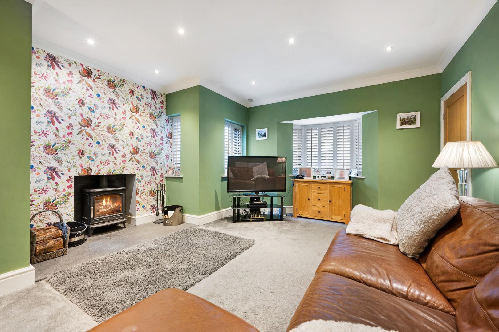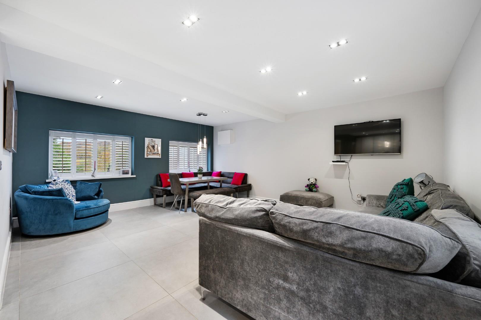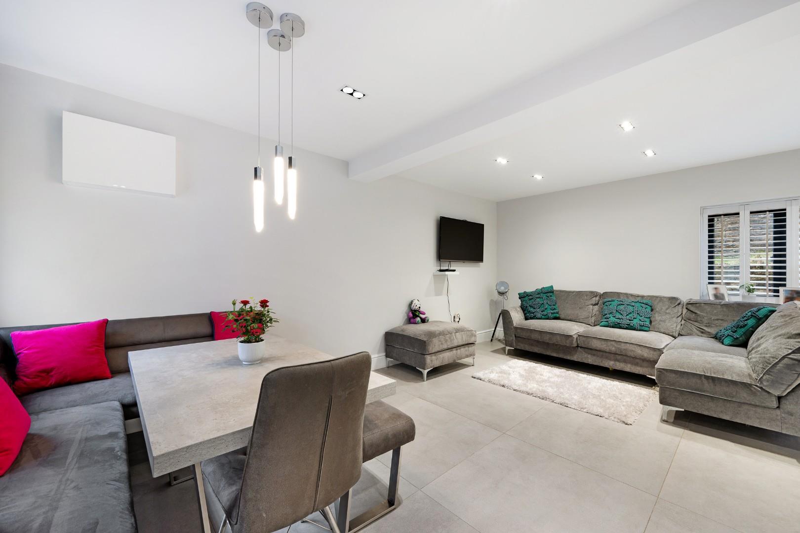 The open-plan design ensures a wonderfully fresh and airy atmosphere, complemented by sleek finishes and thoughtful lighting. In contrast, to the front of the property lies an equally generous yet cosier lounge, complete with a multi-fuel burner set into a recess, the perfect retreat for quiet evenings.