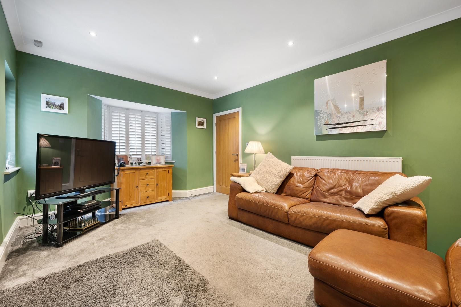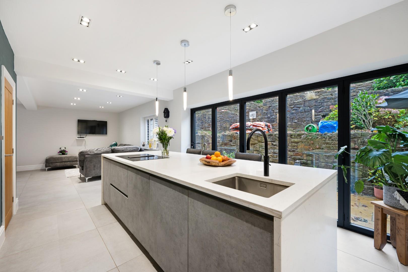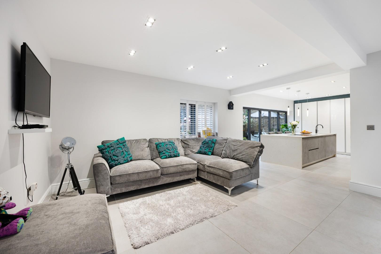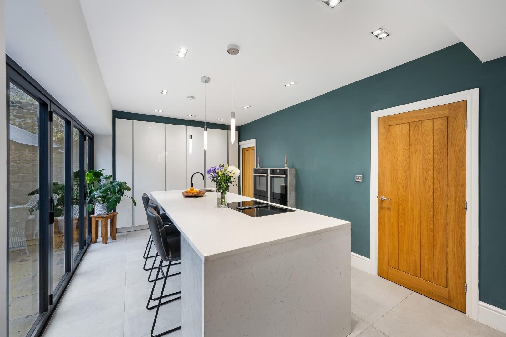 The open-plan design ensures a wonderfully fresh and airy atmosphere, complemented by sleek finishes and thoughtful lighting. In contrast, to the front of the property lies an equally generous yet cosier lounge, complete with a multi-fuel burner set into a recess, the perfect retreat for quiet evenings.