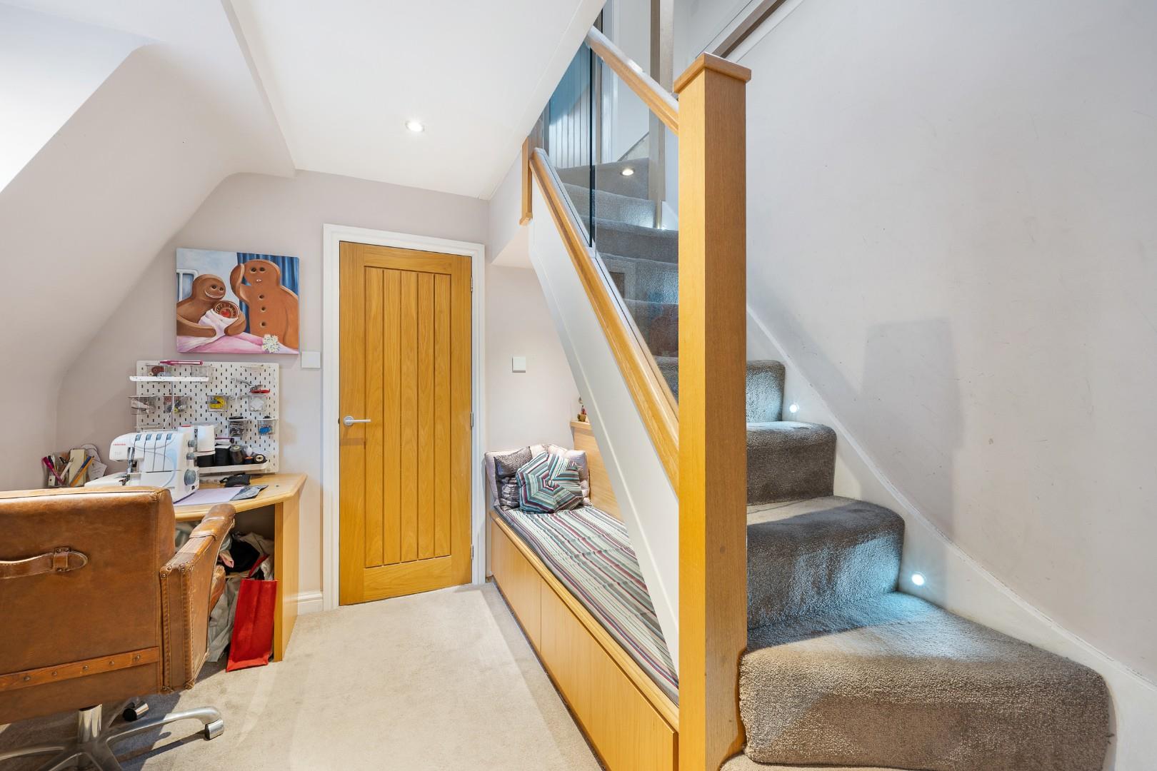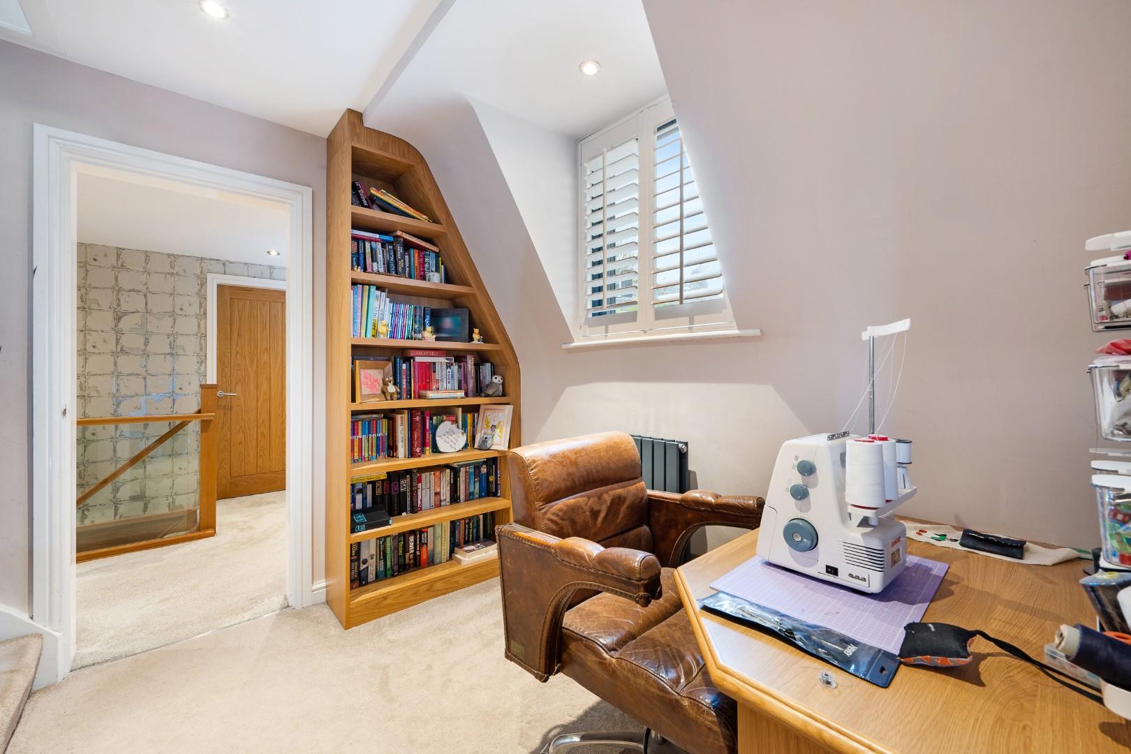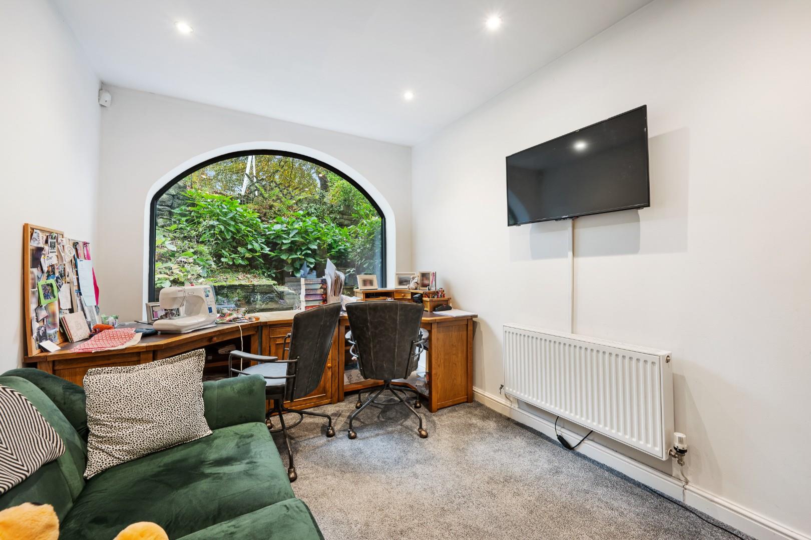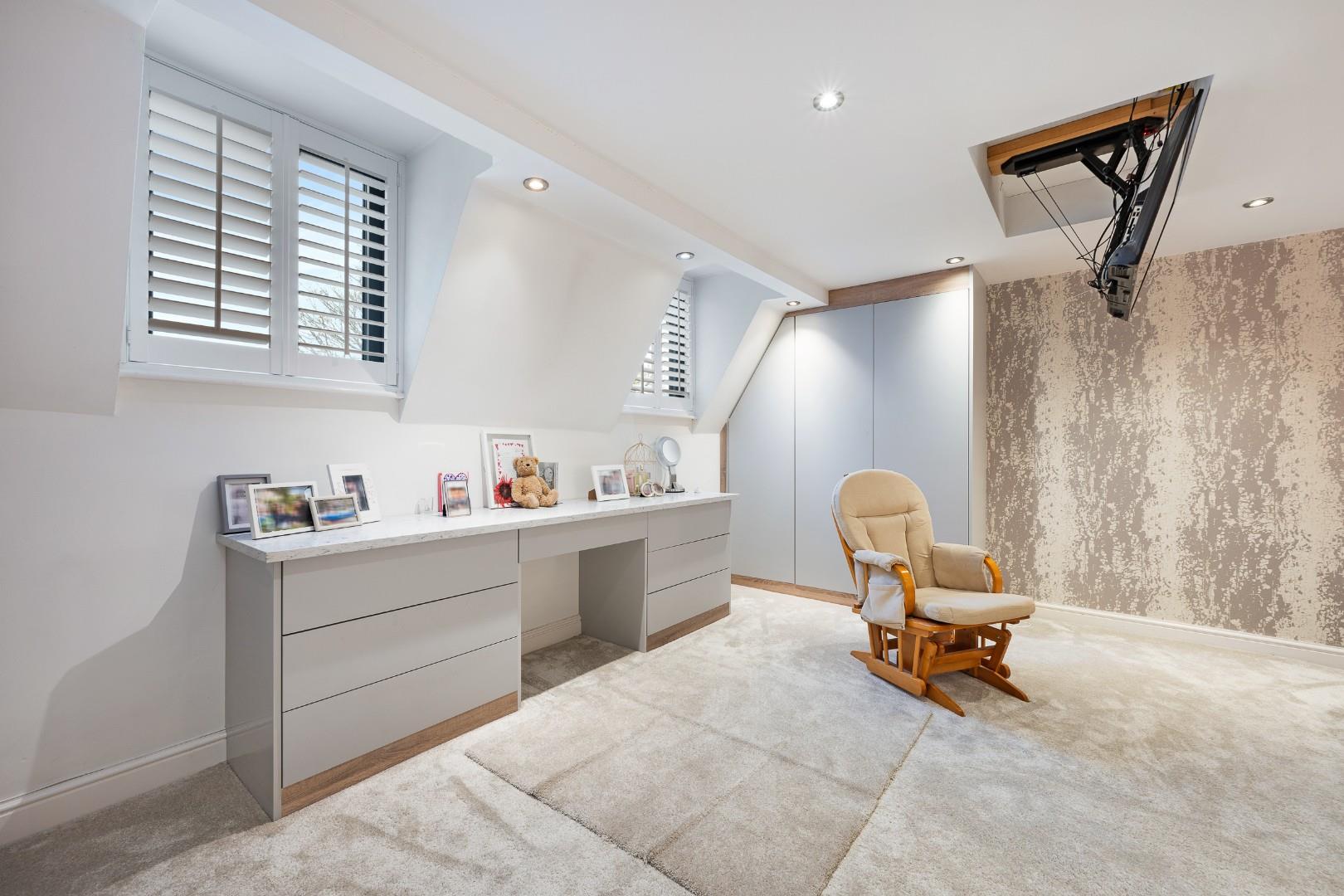 Also on the ground floor is a substantial home office featuring a striking arched window overlooking the garden. This versatile space could also serve as a playroom or snug.