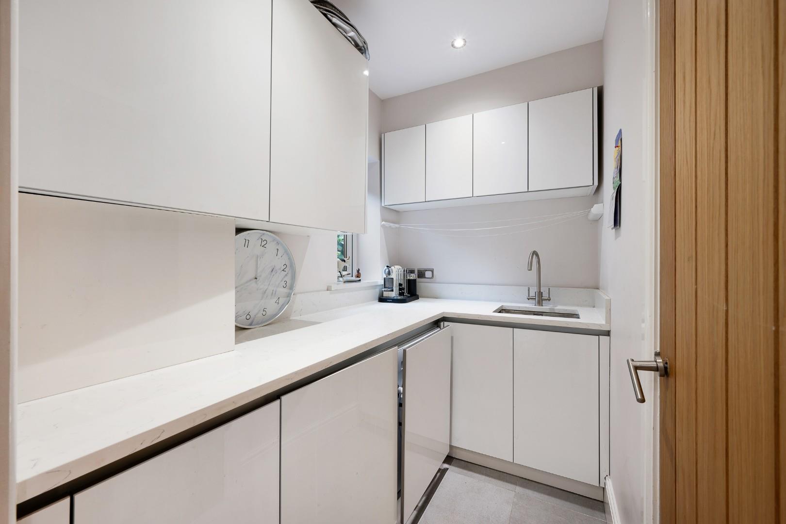 Adjoining the kitchen is a practical utility room, designed in the same stylish modern theme and offering further worktop space, an additional sink, and plumbing for a washing machine and dryer.