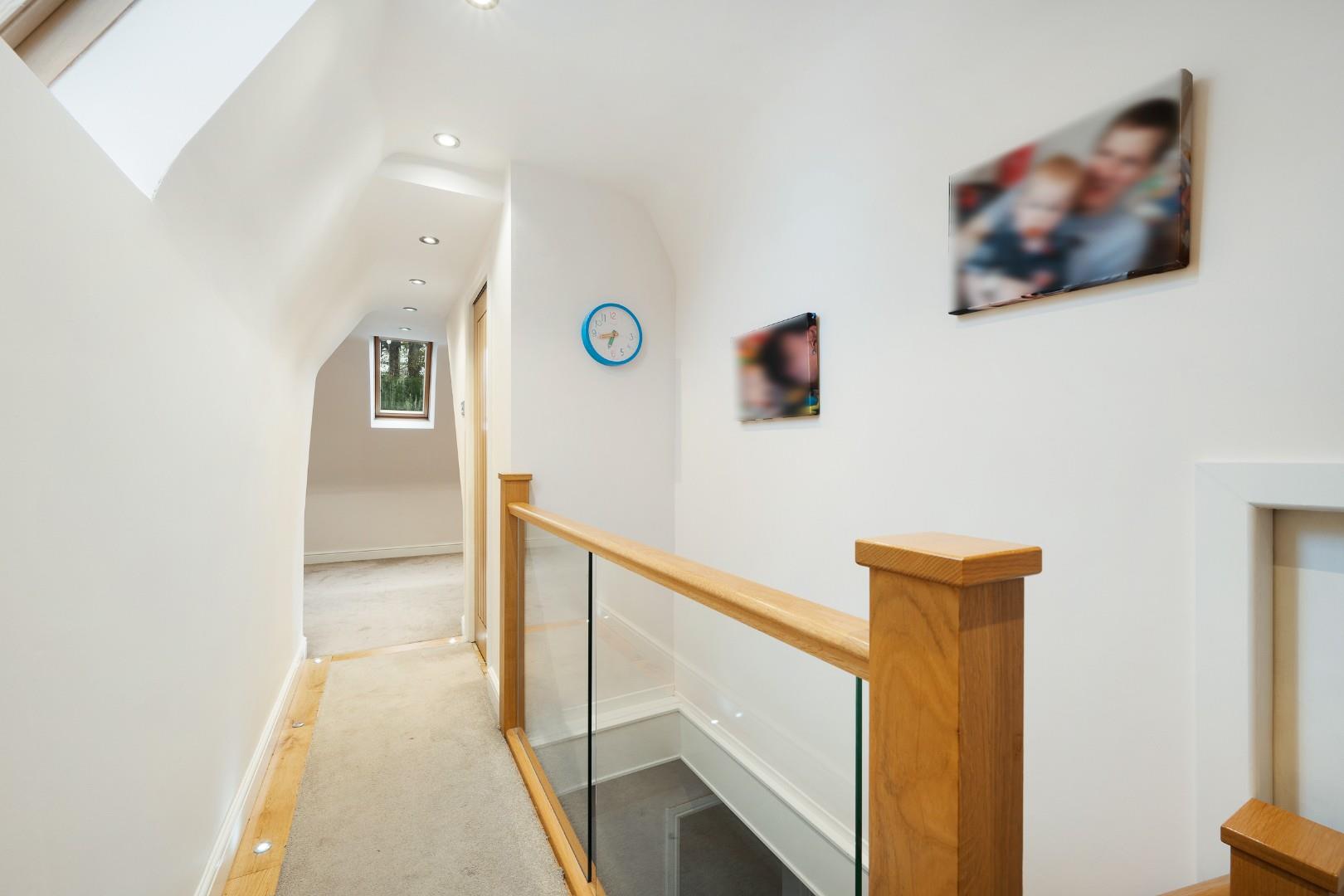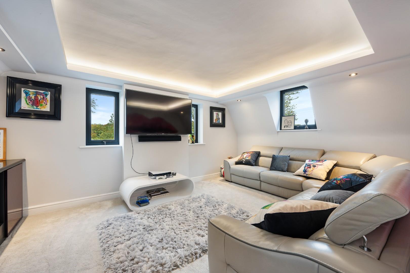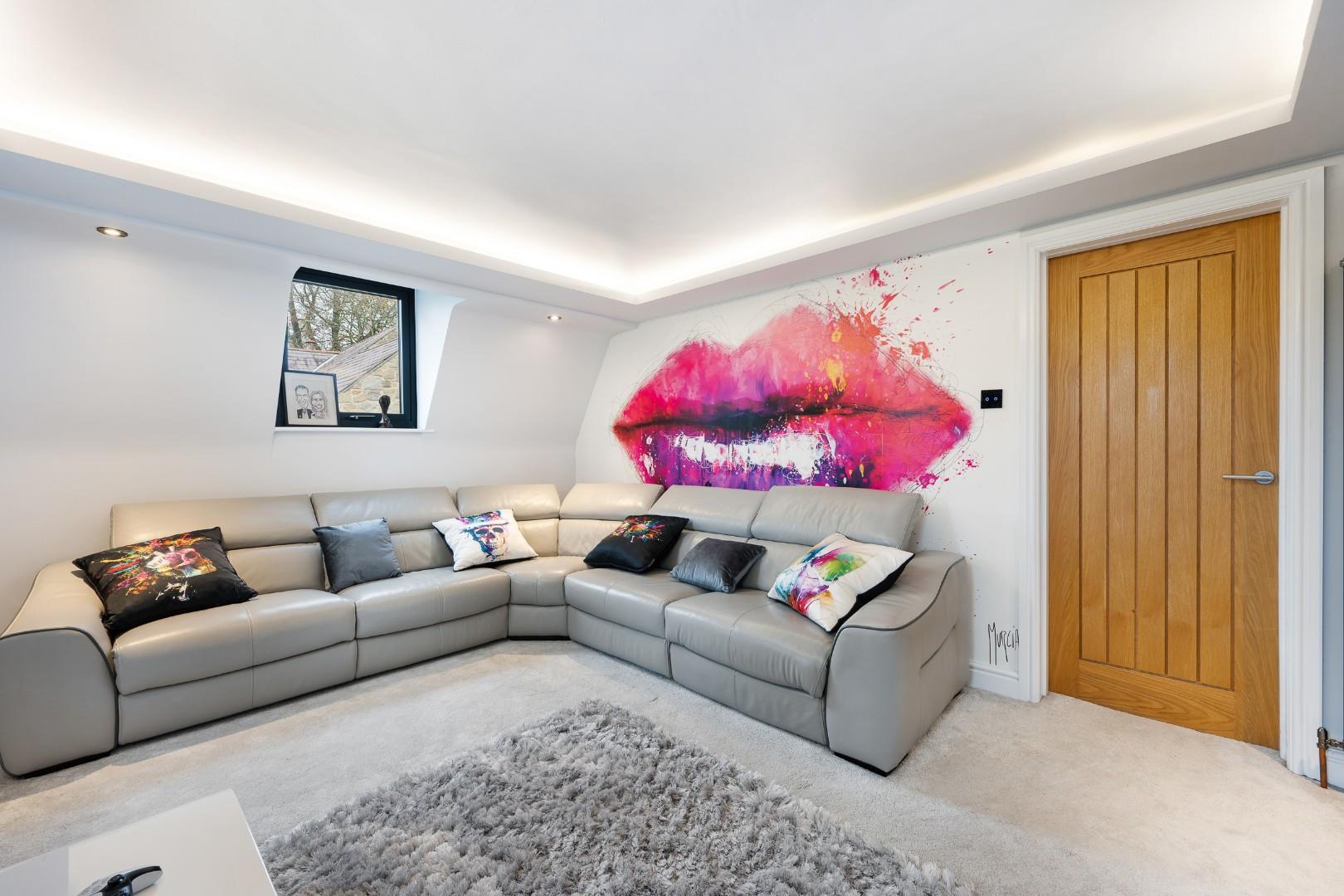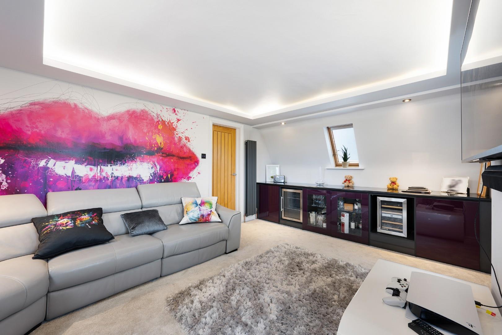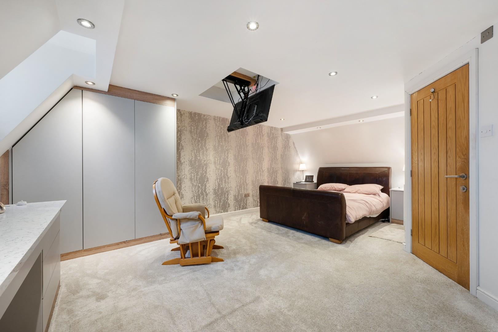 An elegant oak staircase with glass balustrades leads to the first floor, where three large double bedrooms await. One of these rooms is currently enjoyed as an upstairs lounge or cinema room and bar, complete with a Corian worktop, integrated storage, and a feature ceiling with partial slopes — all enhanced by stunning countryside views. Adjacent to this space is a hobby room or secondary study, offering further flexibility.
