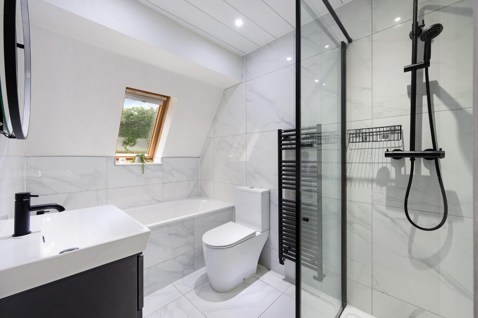 The master bedroom suite includes two sets of fitted wardrobes and a luxurious four-piece en suite bathroom, featuring a bath, walk-in shower, vanity basin and WC. The interior design is refined and contemporary, with marble-effect tiling and matte black fittings for a striking contrast.