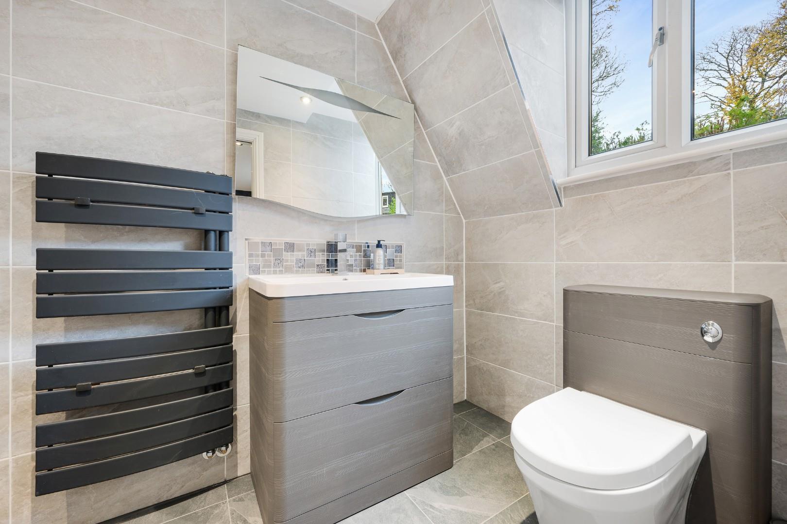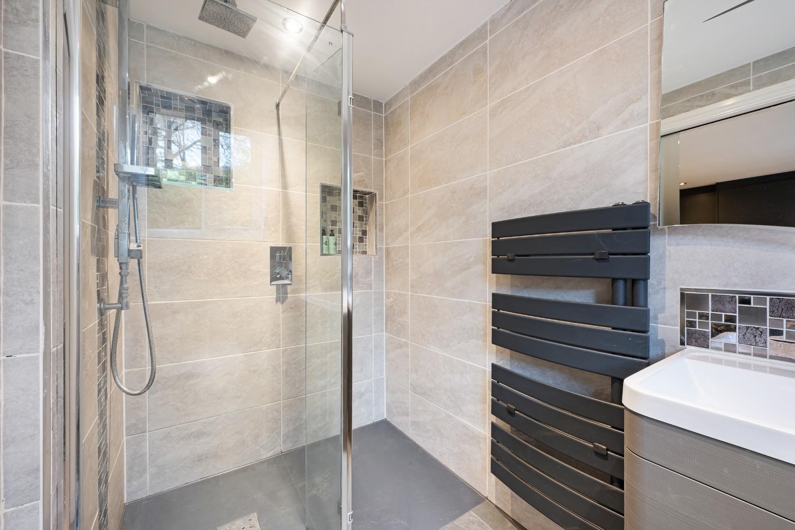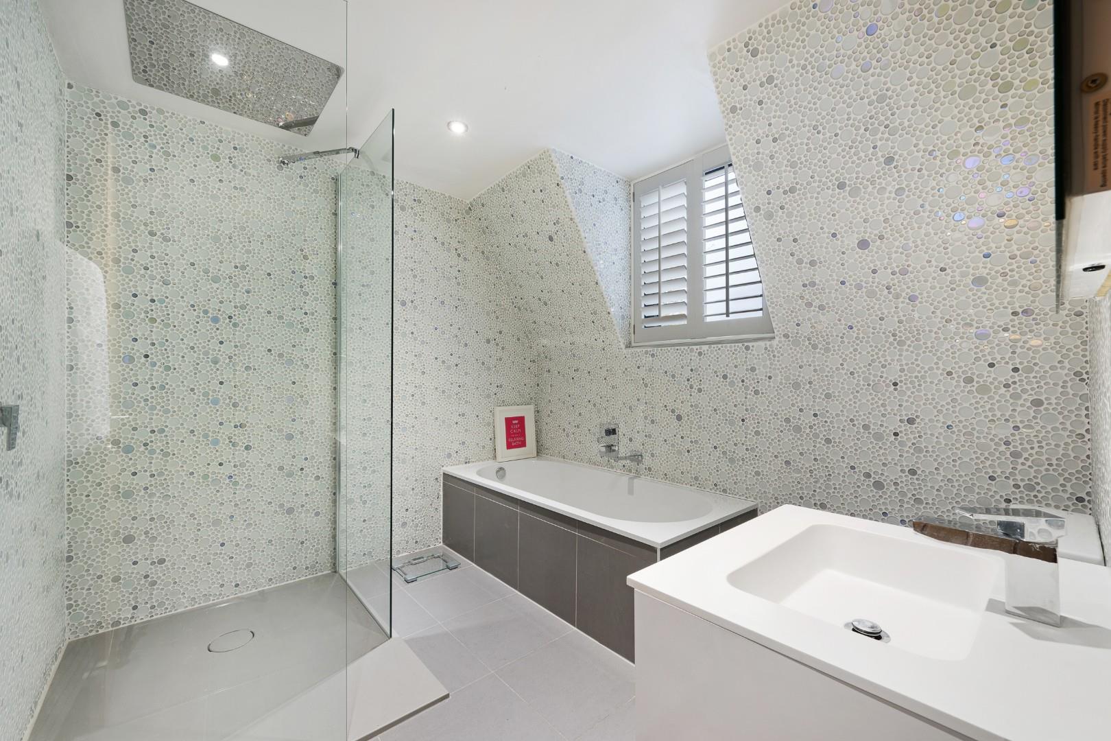 A beautifully finished family bathroom completes this level, boasting Porcelanosa tiling, a four-piece suite with a tiled-in bath, large walk-in shower, vanity basin and WC — all presented in a distinctive, high-spec design.