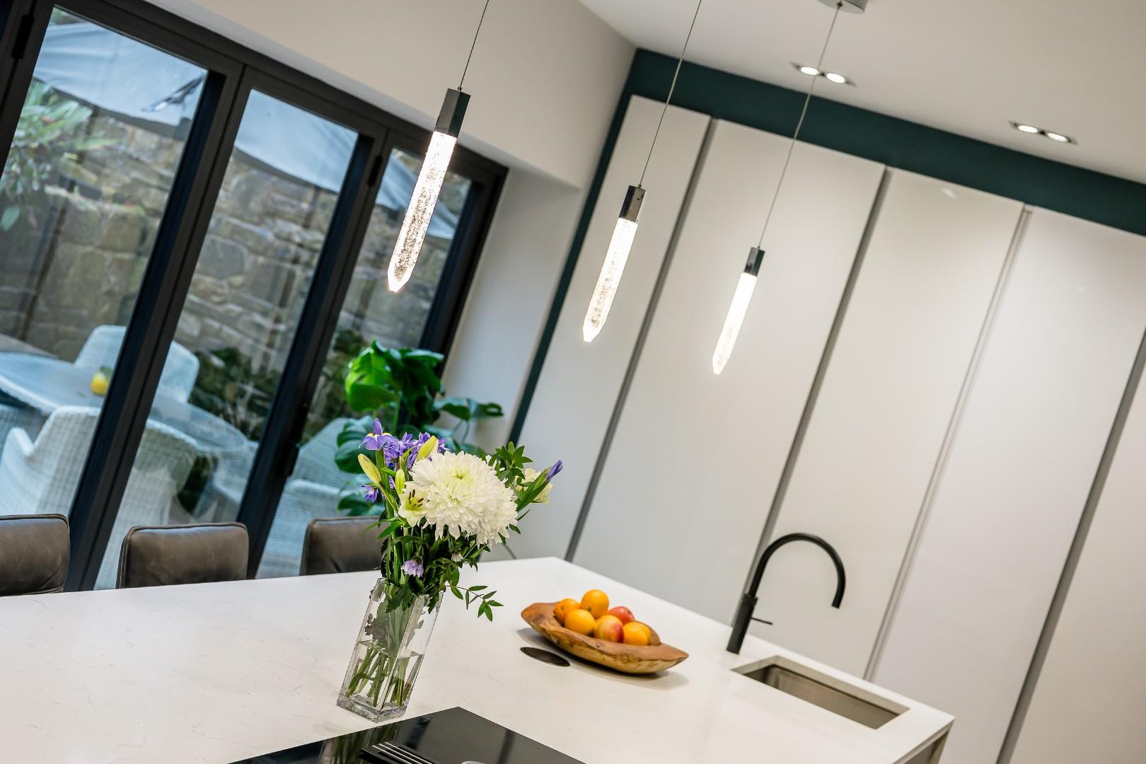 The premium finishes of this delightful family home include bespoke oak joinery, underfloor heating, recessed lighting, bespoke fitted furniture, modern bathrooms and an impressive kitchen with island. All the windows and the bifold doors are the top quality German brand, Schüco, as is the metal front door, which is opened by a keyless fingerprint touch mechanism.