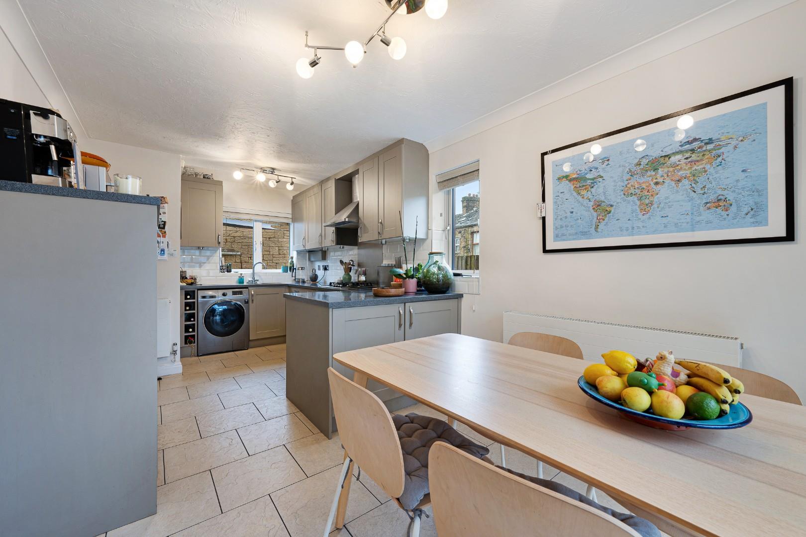 The open-plan kitchen and dining area is located on the opposite side of the entrance hall and continues the fresh, contemporary feel. Grey shaker-style cabinetry is complemented by contrasting dark worktops and a neutral tiled floor. The range of integrated appliances includes a four-ring gas hob with extractor, electric oven, dishwasher, and sink with drainer and mixer tap, along with an allocated space with plumbing for a washing machine.