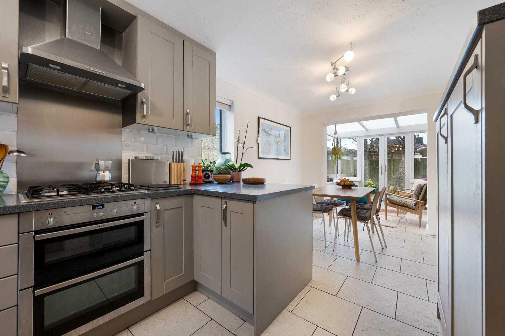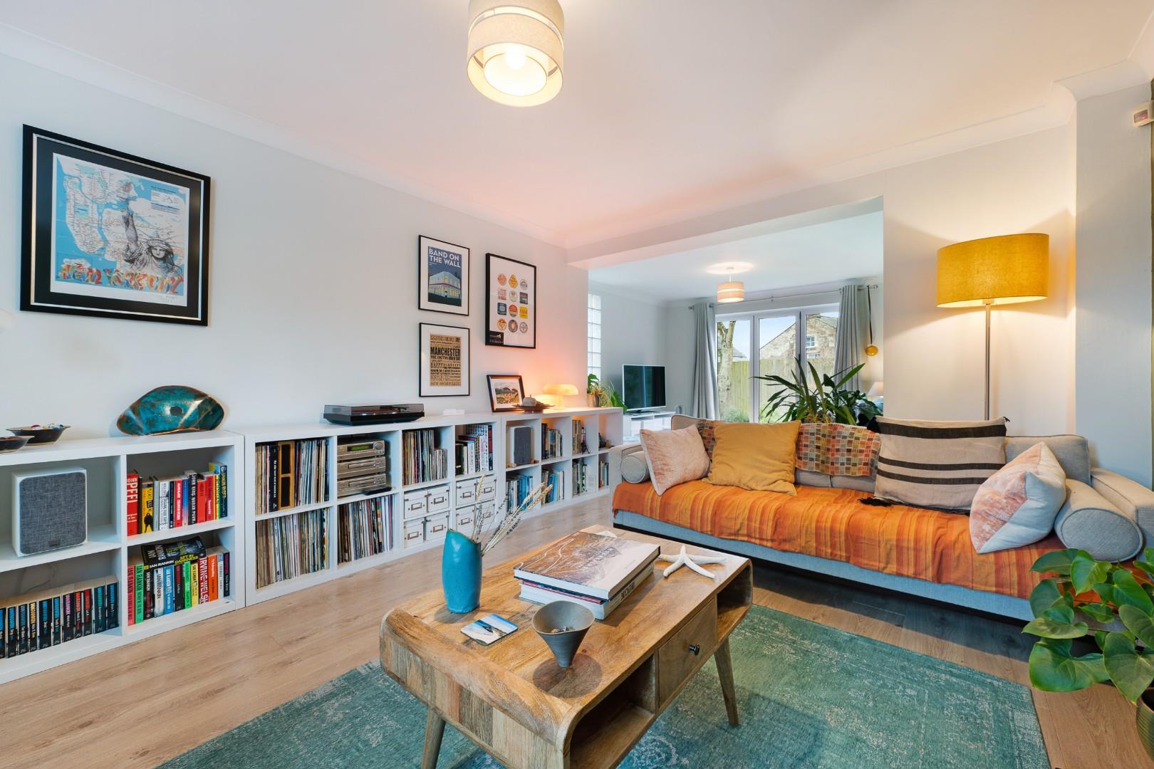 The main living room is thoughtfully arranged to create two separate sitting areas, with natural light flowing in from both the front and rear of the property. The main lounge offers a cosy setting, centred around a gas-burning faux log burner, while the garden room overlooks the landscaped garden through bifold doors and provides fantastic practical appeal during warmer months, where indoor-outdoor living can be fully enjoyed.